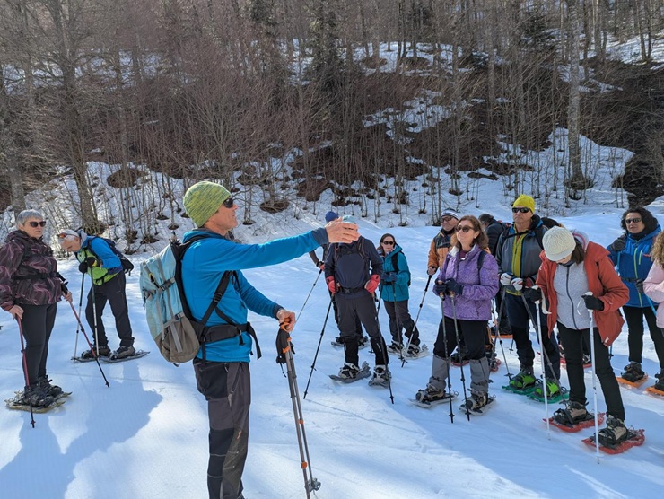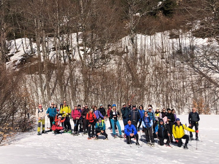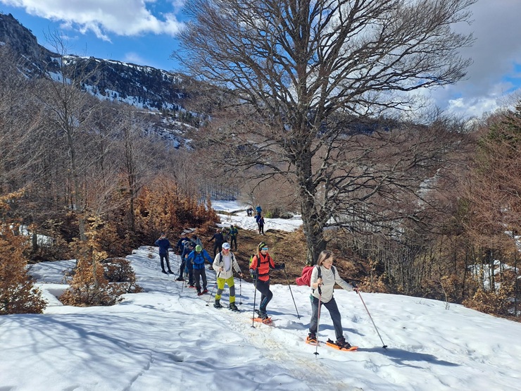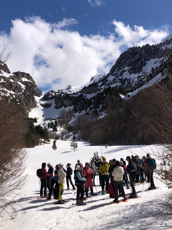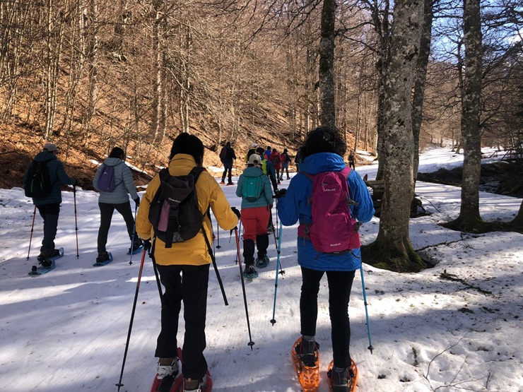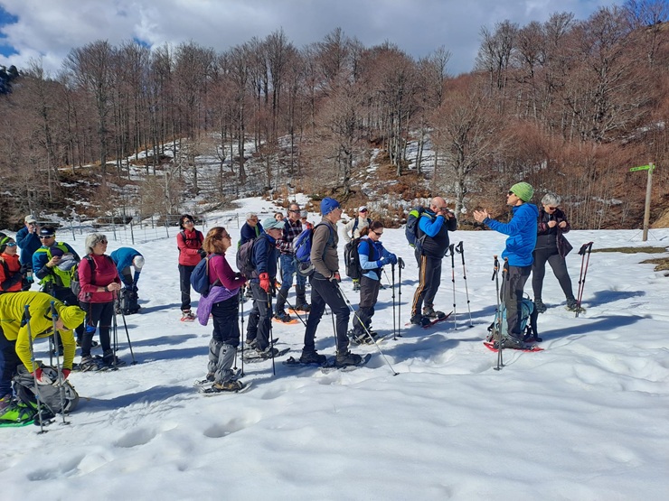 Con un espléndido día de sol y buenas condiciones de la nieve para practicar el deporte de montaña de senderismo con raquetas, la semana pasada disfrutamos de una actividad pendiente de años anteriores, contando, además, con las explicaciones técnicas y botánicas de Carlos, nuestro profesor de la actividad de promoción y extensión educativa “Caminantes”. Hicimos un recorrido suave, pero enriquecedor debido a la paz del hayedo por el que transcurre. En esta época del año se dan la mano el invierno y la primavera, por ello pudimos contar con la nieve todavía presente, el despertar de los pájaros y una temperatura suave que hizo muy fácil la jornada.